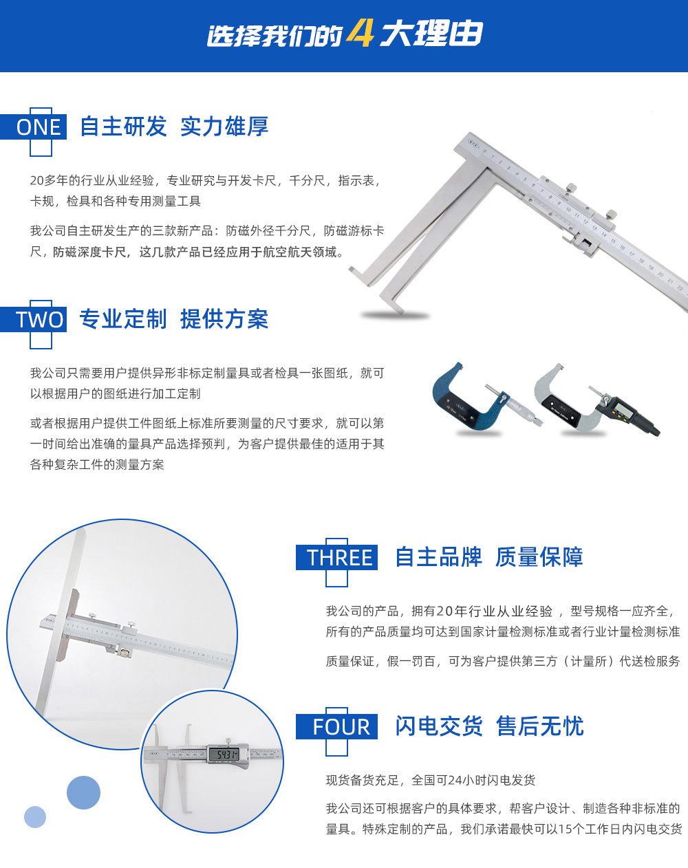 天津桂量量具刃具有限公司,擁有20年的行業(yè)從業(yè)經(jīng)驗(yàn),主要生產(chǎn)游標(biāo)卡尺卡尺,數(shù)顯卡尺,帶表卡尺,各種千分尺,百分表,內(nèi)徑百分表,高度游標(biāo)卡尺,深度卡尺,卡規(guī),檢具和各種測量工具,是一家集設(shè)計(jì)生產(chǎn),銷售為一體的企業(yè)。 我公司開發(fā)生產(chǎn)了三款新產(chǎn)品:防磁外徑千分尺,防磁游標(biāo)卡尺,防磁深度卡尺,這幾…